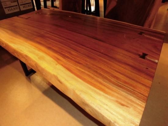 モンキーポッドの一枚板無垢のテーブルです。ジャンボサイズです。天板に穴やへこみがありますが、すべて加工しており、自然観を一層感じます。さらにお届け時には完全仕上げをしますので一層きれいになります。木目も木肌も実にきれいです。これから最終仕上げに入ります。よりきれいになります。