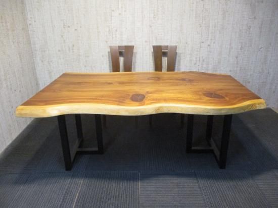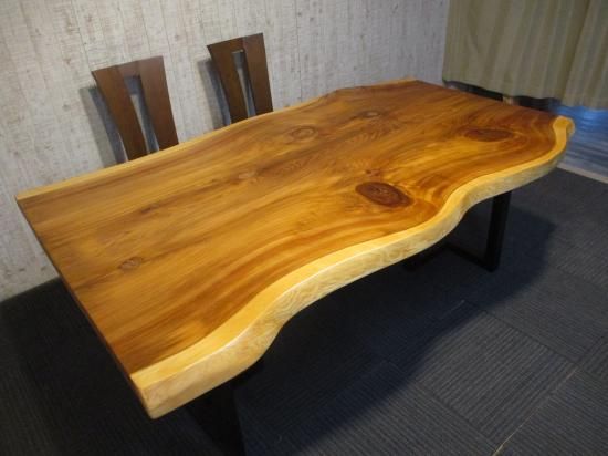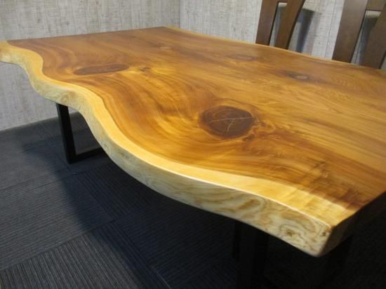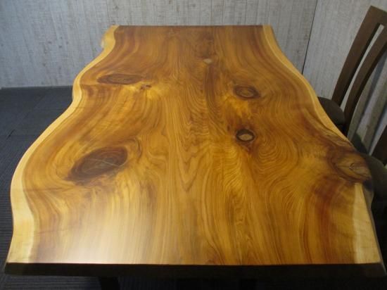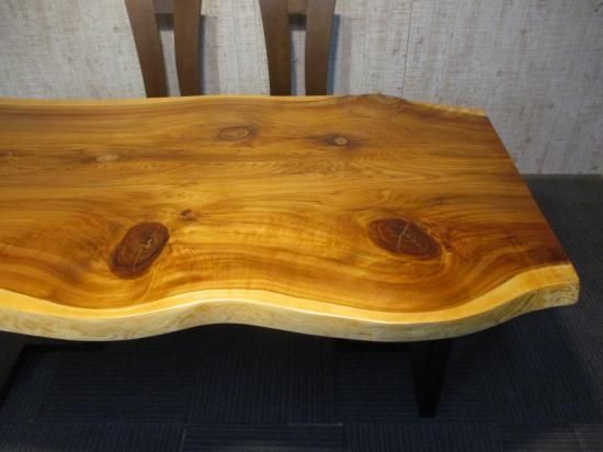 杉の一枚板無垢のテーブルです。樹齢400年の秋田杉です。全体的に濃い色味のテーブルで、人気の天杉にも似ています。耳がきれいです。なかなかこのサイズの秋田杉は市場に出回りません。貴重で、稀少商品です。