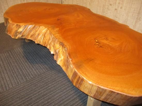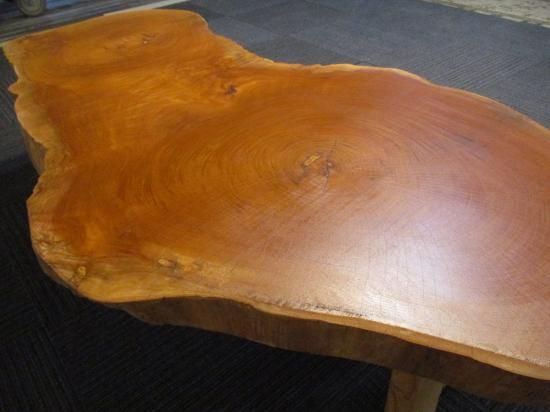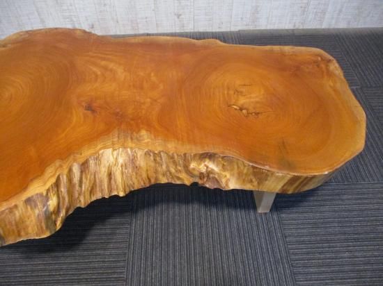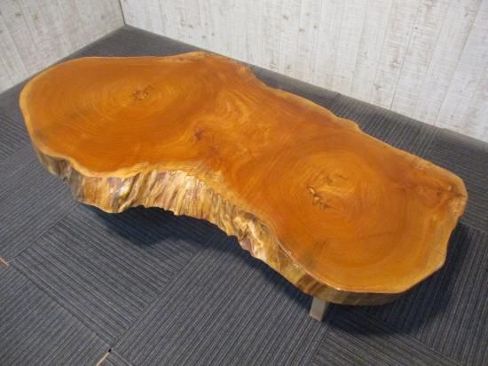 欅の一枚板無垢の輪切りテーブルです。豪華な紅欅で、形が個性的です。目立つ大きな節や節穴もなく、とてもきれいです。ダイニングにもご使用できます。