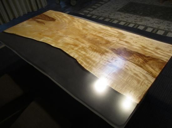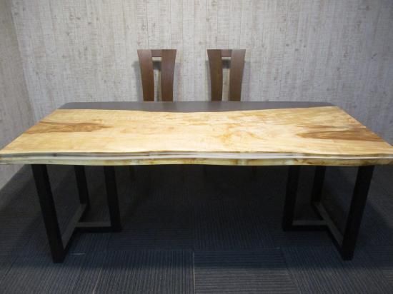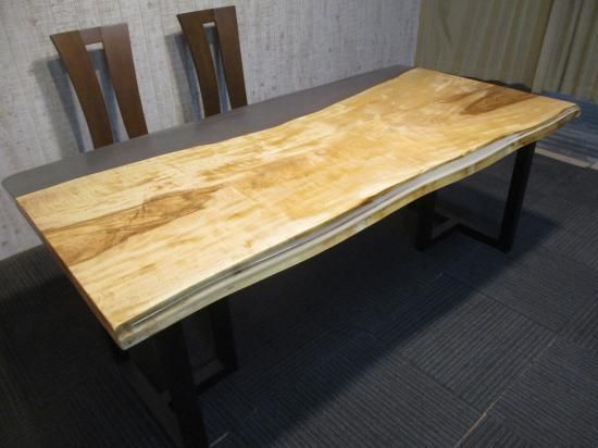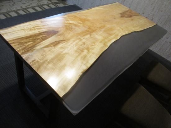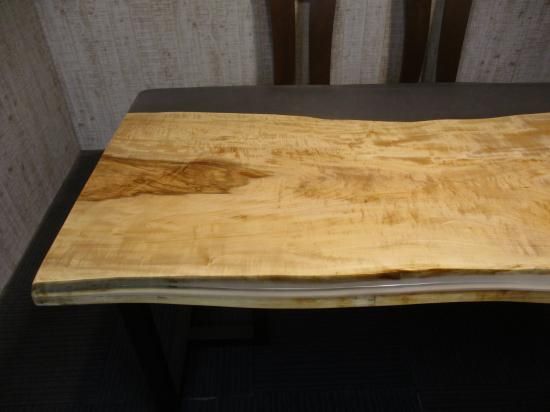 栃の一枚板無垢のテーブルです。人気の栃です。レジン仕上げです。栃の生き生きした模様が素敵です。栃の原木に大量のレジンを使用し、幅広のテーブルに仕上げました。レジン部分は小傷が目立たないようにスモーク仕上げにしました。